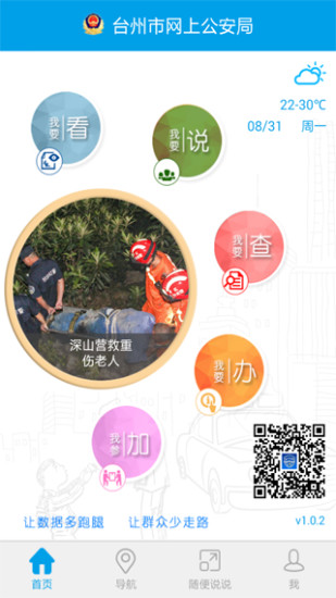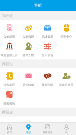 2、五大核心栏目采用模块化设计:"我要看"整合最新警情通报和安全提示,"我要说"开通24小时在线咨询,"我要查"覆盖30余项便民查询,"我要办"支持50多项业务预约,"我参加"搭建警民互动平台;