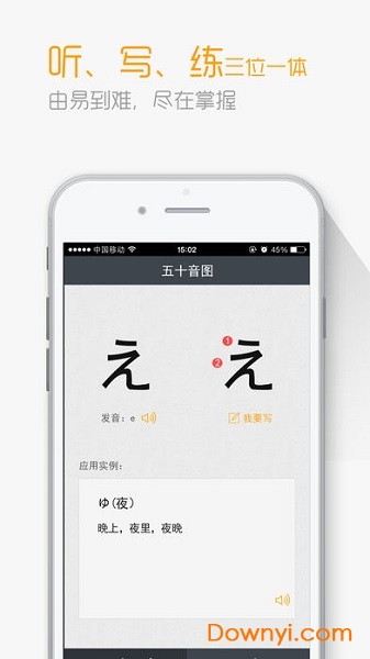 写:提供假名书写动画示范和临摹练习,通过笔顺提示和即时评分系统,帮助用户掌握正确的书写方式。