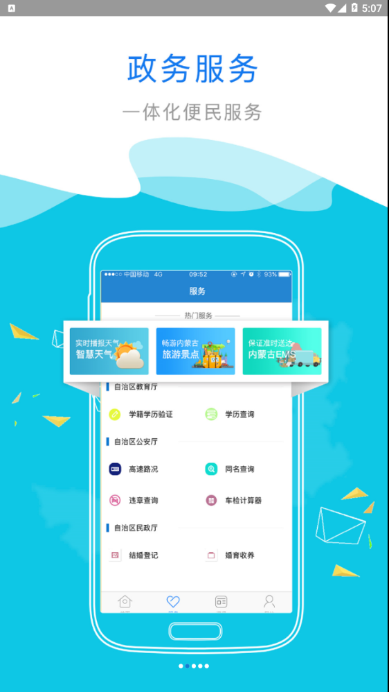 内蒙古互联网+政务服务是由内蒙古自治区人民政府办公厅主导开发的智能化政务服务平台,基于"互联网+政务服务"理念打造。该平台以"最多跑一次"为核心理念,通过数字化手段重构政务服务流程,实现了从线下到线上的服务转型。平台不仅提供常规的办事服务,还整合了交通违章查询、社保公积金查询、医疗预约等高频便民功能。同时,通过大数据分析用户需求,不断优化服务体验,让政务服务更加精准高效。用户只需一部手机,就能随时随地享受便捷的政务服务,真正实现了"指尖办事"的便利。