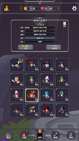 6、最终还是惨败了,失败之后来到游戏主界面,这里可以选择角色,说不定高级角色会更简单呢。每个角色都有独特的初始装备和技能,建议多尝试几个找到最适合自己的。