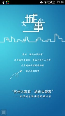 城事大家管app是一款数字化便利效劳管理客户端应用,它是苏州市管理局开发的一个便当的公共城市管理信息搜集效劳客户端,该软件允许每个公民,参与管理城市大小的事情,欢迎下载体验!