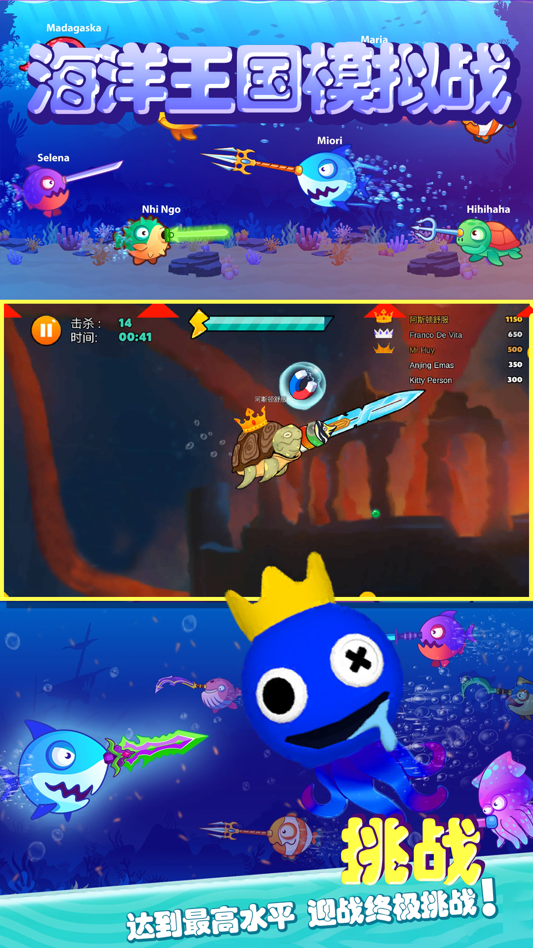 海洋王国模拟战是一款充满刺激与挑战的海底io大乱斗游戏。在这个充满未知与冒险的海洋世界中,你将化身为一条小鱼,通过不断吞噬其他鱼类来进化成长,提升自己的体积与力量。随着游戏的深入,你可以解锁更多强力武器和技能,在激烈的战斗中击败对手,最终成为称霸海底的王者。游戏采用多人在线竞技模式,让你能够与来自世界各地的玩家同场竞技,体验紧张刺激的生存对决。