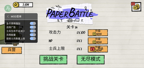 《火柴人纸上战争内置菜单版》是一款以火柴人为主题的策略战争游戏,玩家将扮演指挥官,率领不同兵种的火柴人军团在简约的地图上展开激烈征战。游戏采用丰富的策略作战玩法,玩家需要根据战场形势灵活搭配兵种组合,制定最佳作战方案。通过不断挑战关卡,玩家可以解锁更多兵种和装备,逐步壮大自己的火柴人帝国。游戏操作简单易上手,但策略深度十足,既能满足休闲玩家的需求,也能让硬核策略玩家找到挑战乐趣。