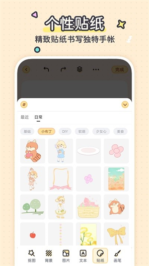 AI美学助手能自动优化版面配色,根据内容智能推荐贴纸组合,即使是设计新手也能轻松制作ins风手帐。2、互动式新手教程采用游戏化引导机制,完成特定任务可解锁稀有素材,30天即可进阶为手帐达人。3、季度限定素材包网罗全球热门IP,从迪士尼联名到故宫文创,持续带来新鲜创作元素,节日期间更有惊喜彩蛋功能上线。