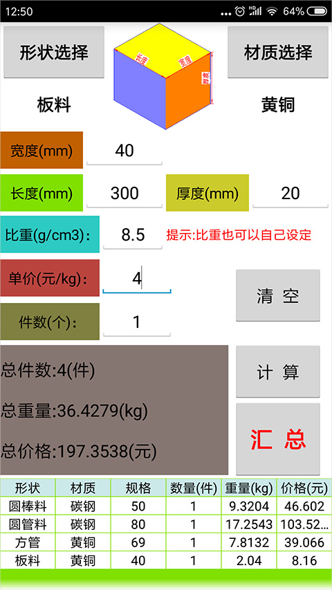 多种常见材质的计算功能:材料计算器App支持钢材、铝材、混凝土等30余种常见工程材料的专业计算。涵盖体积、重量、面积等15个计算维度,并内置行业标准参数库,确保计算结果符合工程规范要求,让项目经理可以轻松应对各种复杂计算场景。