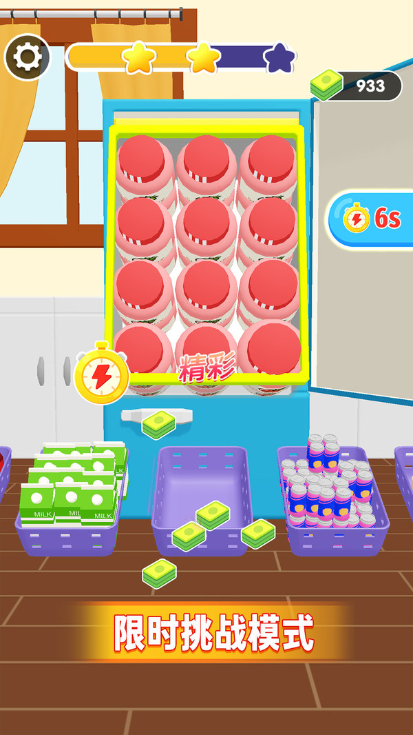 2、除经典模式外,游戏还包含限时挑战、反转收纳(从装满的冰箱中快速找出指定物品)、双人协作等8种特殊玩法。每周轮换的"疯狂周末"模式会随机组合三种玩法机制,比如同时出现会融化的冰淇淋和会自动膨胀的发酵面团。