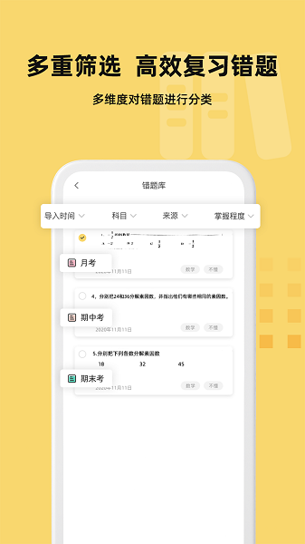 2、错题整理和筛选,按科目整理错题,按导入时间、错题来源、掌握程度筛选错题;支持自定义标签系统,用户可以为每道错题添加多个标签,实现更精准的分类管理。