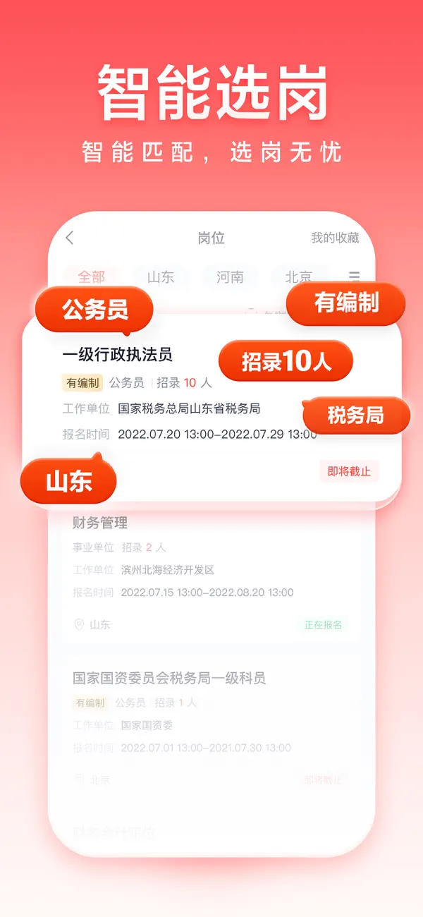 【选】智能匹配,选岗无忧。根据你的意向地区、学历、专业和政治面貌等智能匹配合适的岗位,从此告别大海捞针式收集信息,节约时间高效选岗。