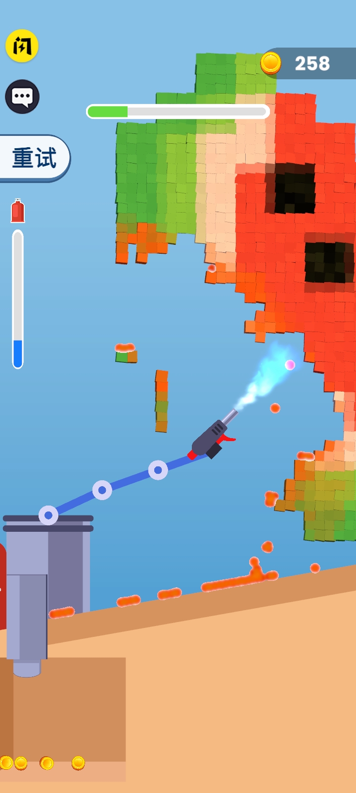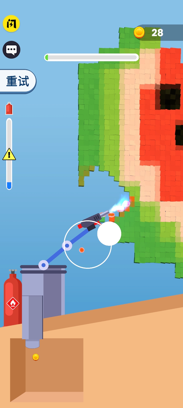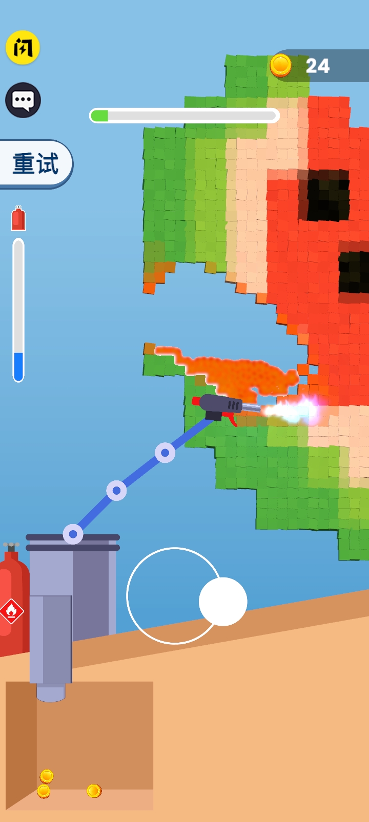 火焰破碎机是一款充满刺激与挑战的破坏类游戏,玩家将扮演一名手持火焰喷射器的破坏者,通过喷射火焰来烧毁面前的所有可燃物品。游戏的核心玩法围绕着完成各种烧毁任务展开,每一关都需要玩家合理规划火焰喷射器的使用,同时注意燃料的消耗,确保在有限的资源内完成任务。游戏画面逼真,火焰效果绚丽,带给玩家身临其境的破坏体验。