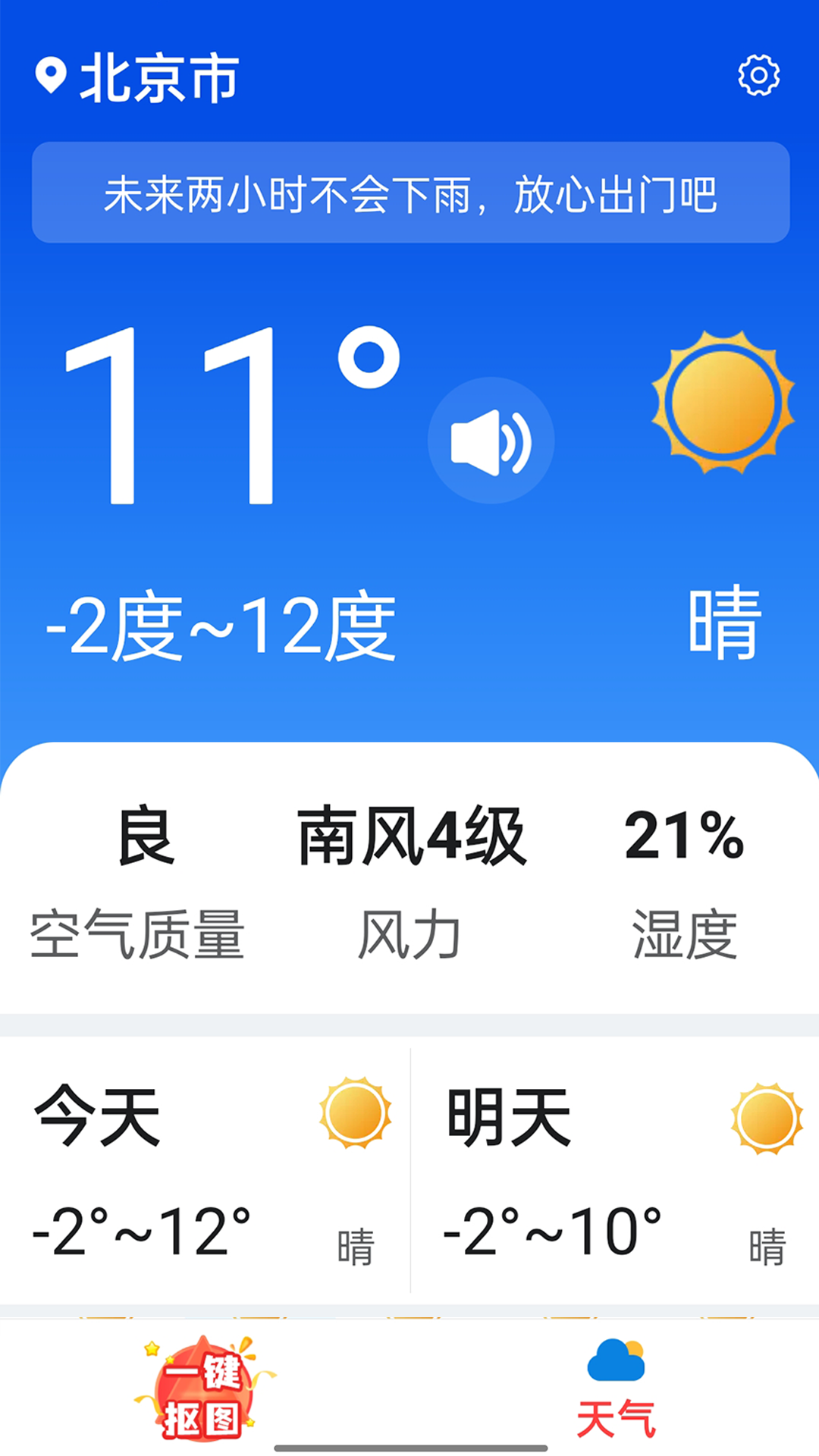 天气显示:软件还贴心地集成了天气查询功能,用户可以通过定位自动获取当地的实时天气信息,包括温度、风力、空气质量等详细数据。这项功能可以帮助老年人合理安排户外活动时间,为日常出行提供参考,让生活更加便利安全。