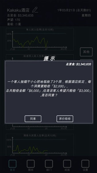 模拟经营我的酒店是一款由KakaKuGames精心打造的文字向酒店经营模拟游戏。游戏采用独特的黑色调视觉风格,界面设计简约大气,同时参考了现实酒店的真实布局,为玩家带来沉浸式的管理体验。在游戏中,你将化身酒店总经理,全面掌控酒店的运营与发展。从基础建设到人员管理,从客房定价到市场营销,每个环节都需要你运筹帷幄。游戏提供了详尽的数据分析系统,让你可以随时查看各类经营指标,比如不同房型的入住率、客户满意度等,帮助你做出最优决策。通过不断优化经营策略,你将见证酒店从默默无闻发展到行业翘楚的全过程。