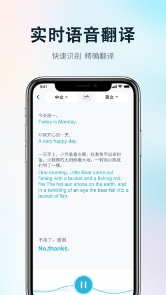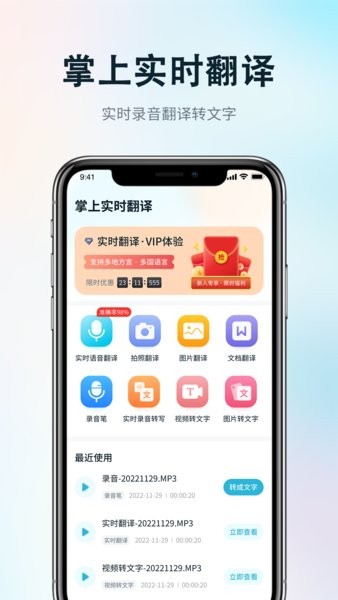 支持在会议、课堂、采访、讲座等场景下实时将现场录音同步转换为文字。支持将口述的语音翻译为目标语言的文字和语。新增云端同步功能,所有翻译记录自动备份,可在多设备间无缝切换使用。