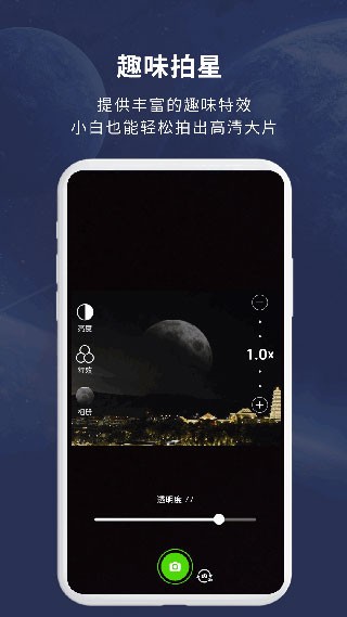 6.如果照片效果不满意,可以在拍摄界面点击左侧【特效】按钮,这里有20多种专业滤镜可选。用户还可以调整曝光、对比度等参数,让星空照片更具艺术感。