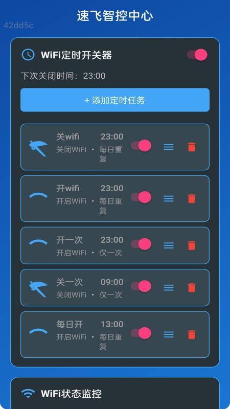 通过"定时任务"功能,用户可以设置精确的WiFi开关时间,系统会在指定时间自动执行操作,无需手动干预。