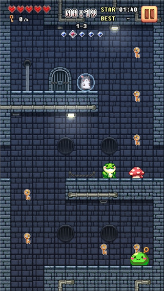 《超级仓鼠球》是一款画风治愈、操作简单的益智休闲游戏。在这款游戏中,玩家将扮演一只从宠物店逃出来的机灵仓鼠,踏上充满挑战的地下世界冒险之旅。别看仓鼠外表呆萌可爱,它们可是拥有强大的战斗力!游戏提供多种不同能力值和个性的仓鼠供玩家选择,每只仓鼠都配有坚固的仓鼠球作为装备。玩家需要通过点击屏幕左右两侧来控制仓鼠移动,收集关卡中的所有钥匙并安全抵达出口。途中还能踩扁那些威胁仓鼠的坏蛋,体验爽快的战斗乐趣。游戏融合了像素风格与街机元素,关卡设计巧妙,后期难度极具挑战性,快来下载体验这场别开生面的仓鼠大冒险吧!