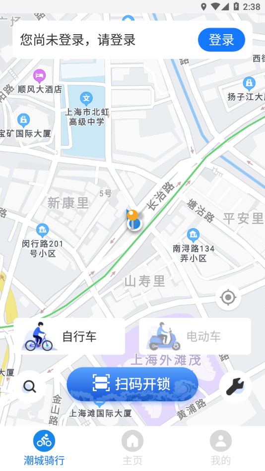 (4)完成以上操作后,找到一辆可以正常使用的公共自行车,在本应用中点击"扫码租车"按钮,扫描车锁上的二维码,即可开锁骑行;系统会同步开始计费,并在APP内显示实时骑行时长和预估费用。