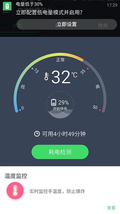 手机降温:当检测到手机温度过高导致耗电加快时,软件会自动启动降温模式,有效降低设备温度;
