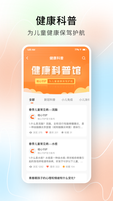 权威专家给出的健康科普知识,全面实用,还有针对当季的热点问题进行专业解析,知识更新每日推送,让您对少儿常见问题不再困扰,应对自如。
