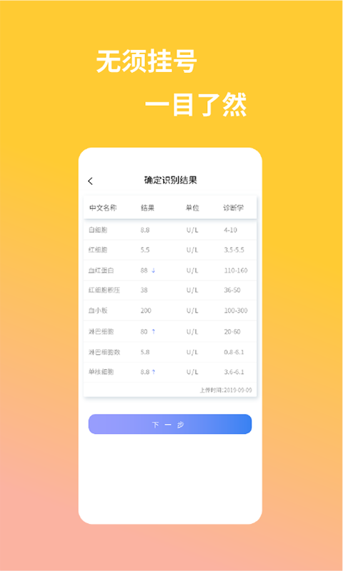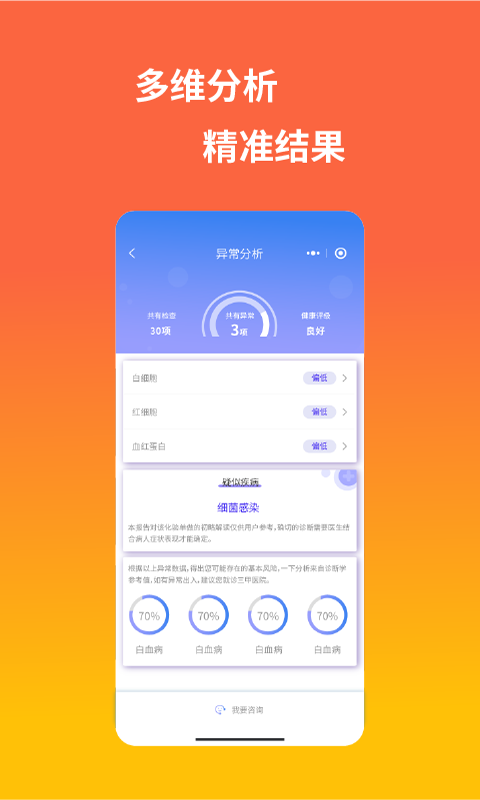 3、检验报告智能识别技术可自动解析血常规、尿常规等30多种常见检查项目,3秒内生成通俗易懂的解读报告。