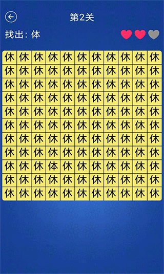 汉字找不同是一款极具挑战性的汉字益智游戏,专为喜爱文字和观察类游戏的玩家设计。游戏采用经典的11×11方格布局,每个方格中填充着看似相同的汉字,但其中隐藏着一个与众不同的汉字。玩家需要在规定时间内找出这个独特的汉字,考验的不仅是眼力,更是耐心和专注力。游戏设置了严格的容错机制,每关仅允许三次错误机会,一旦超过限制就必须重新开始,大大提升了游戏的挑战性和可玩性。