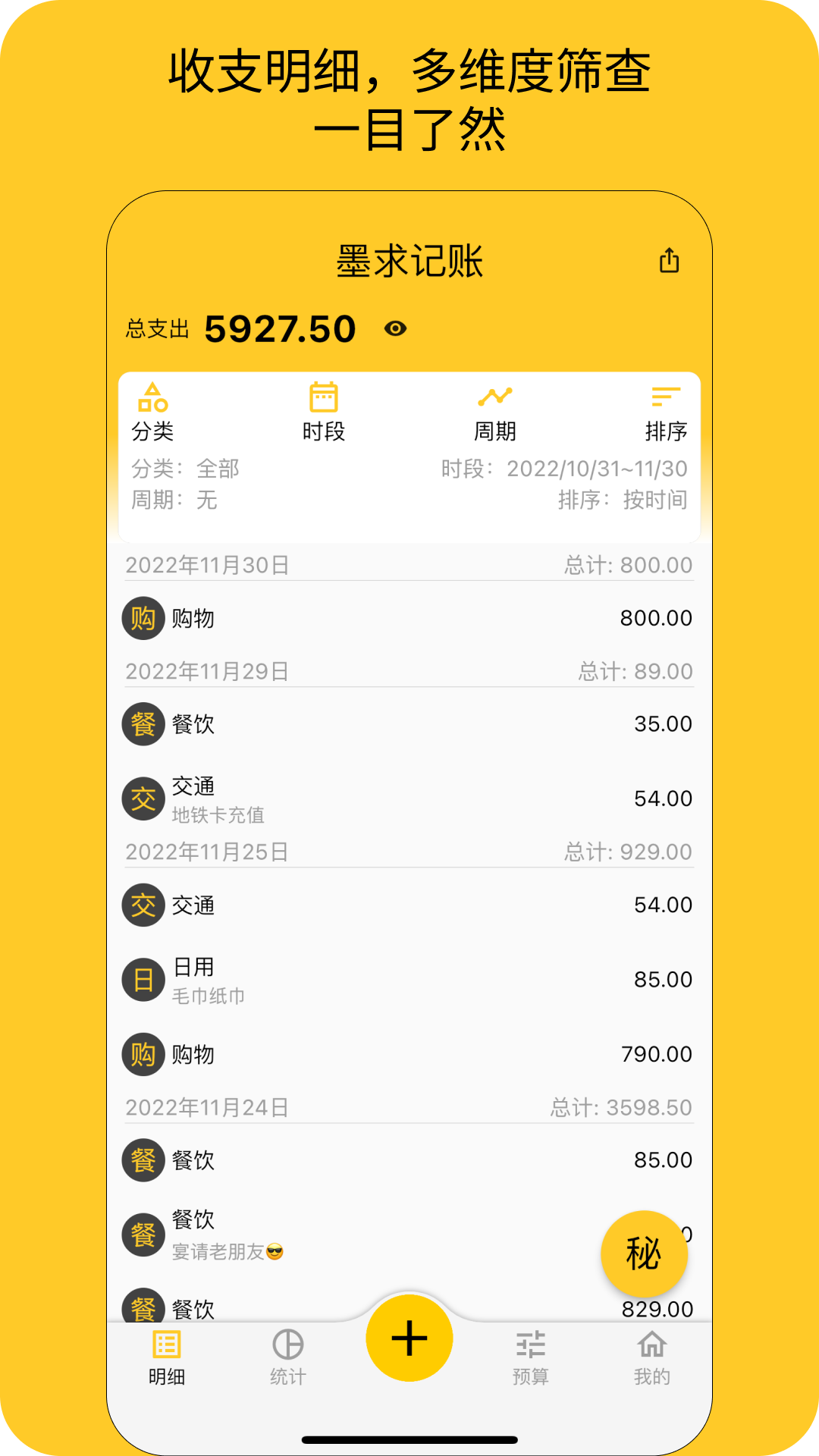 -高级排序:支持按类别、时间、周期、金额等多种方式排序账单,让数据呈现更加直观,便于分析和管理。