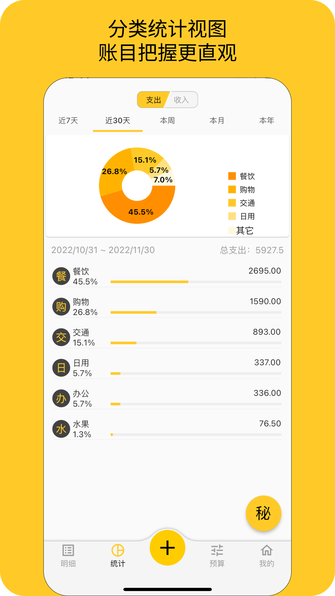 -统计视图:通过直观的图表展示不同类别的收支情况,帮助用户快速了解财务状况,做到心中有数。