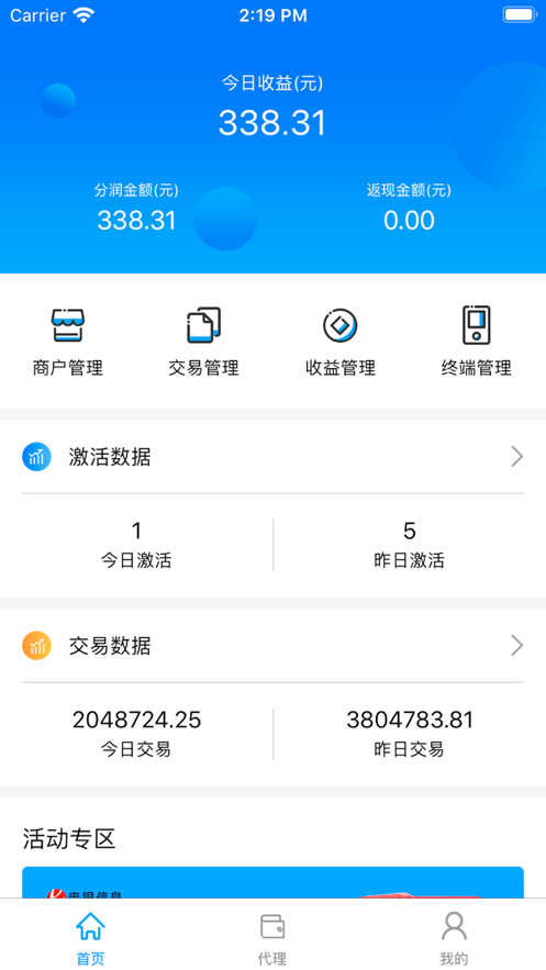 收益明细:可视化图表展示日/月收益趋势,支持按商户、终端等多维度筛选,自动生成电子对账单供下载留存。新增收益异常预警功能,当账目波动超过阈值时实时推送提醒。