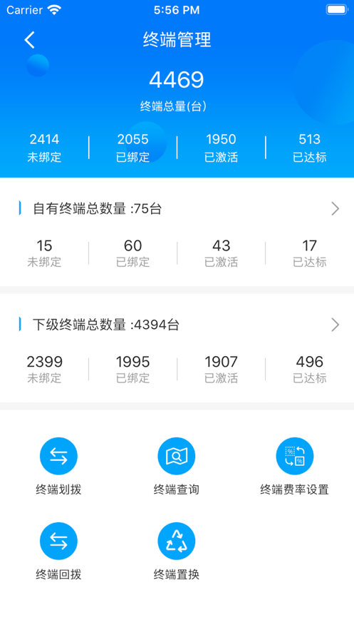 终端管理:搭载物联网技术,可远程监控终端状态(电量、网络、交易量),支持批量划拨设备到下级渠道。新增设备定位功能,防止终端异常移动。