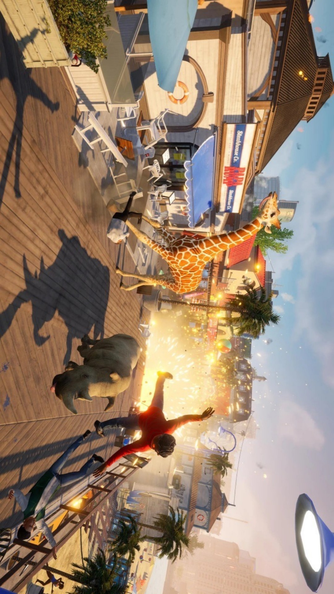 游戏最大的特色就是各种脑洞大开的互动玩法。你可以用山羊的舌头黏住任何物体,甚至能把路人拖来拖去;用角撞击物品会引发连锁反应,制造出令人捧腹的混乱场面。游戏还设置了大量特殊能力,比如喷射飞行、超级跳跃等,让恶作剧更加疯狂。与环境的互动充满惊喜,比如踢飞垃圾桶、撞翻货架等行为都会引发NPC的夸张反应。这些搞笑的互动设计让游戏充满了欢乐与挑战。