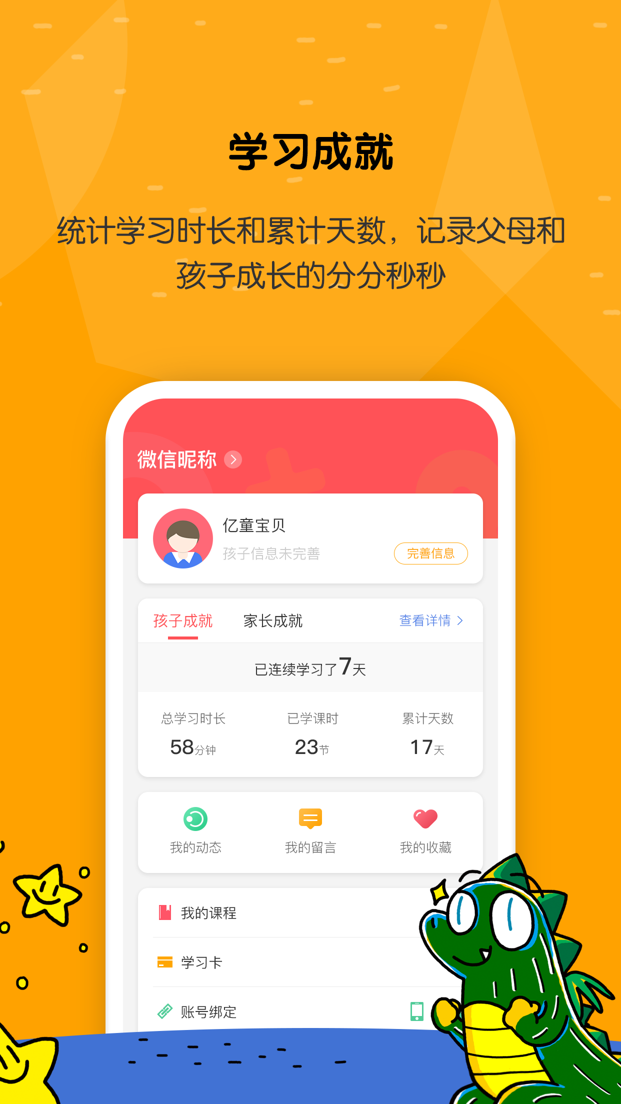 4.【学习记录】系统自动统计家长和孩子的学习时长及累计天数,清晰呈现亲子共同成长的点点滴滴,见证每个进步时刻。