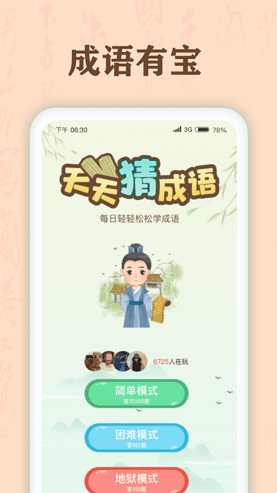 用户可通过简单、困难、地狱三种模式进行成语知识问答,海量题库等你来挑战,轻松获取知识。支持离线学习功能,随时随地都能进行成语练习。