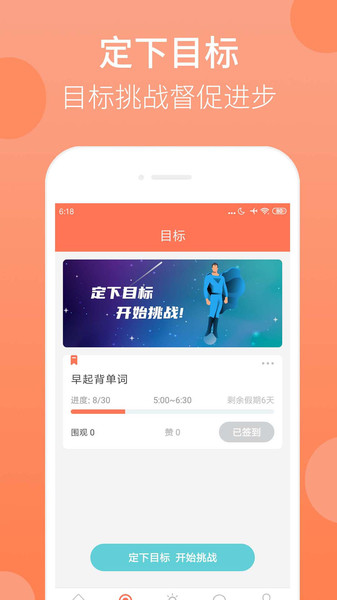 打开应用后,您可以在首页看到清晰的目标设置入口。点击进入目标页面后,系统会引导您设定个性化的早起目标,比如"连续7天6点起床"。确认目标后,只需点击"我同意"按钮即可开启打卡挑战。每天清晨,当闹钟响起时,您需要在规定时间内完成打卡操作,系统会自动记录您的早起数据并生成精美的成就卡片。