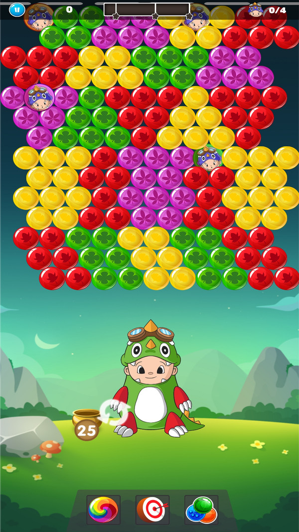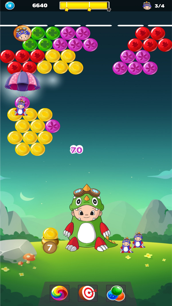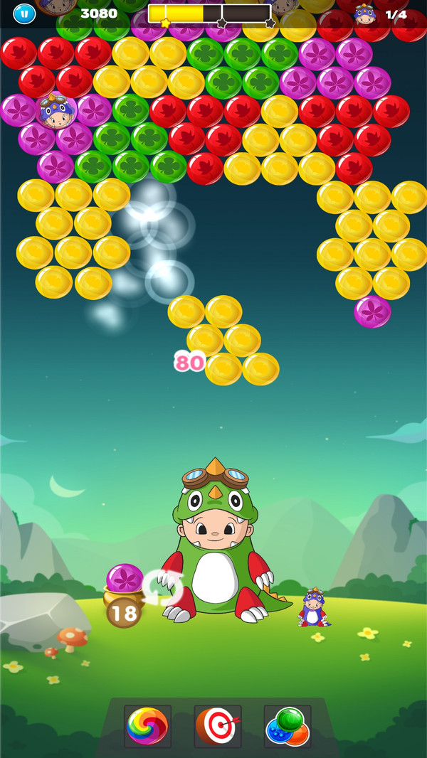 在挑战中,能够连续消除一个颜色的泡泡的话,是能够获得翻倍积分奖励,连续消除次数越多奖励越丰厚。根据下方手中拿的泡泡去点击相同颜色泡泡位置就可以把上方的消除掉,精准的瞄准能帮助你更快通关。还要更换的话就点击左下的预览泡泡圆圈中进行交换颜色相同的就没有点击了,灵活运用这个功能可以让你事半功倍。