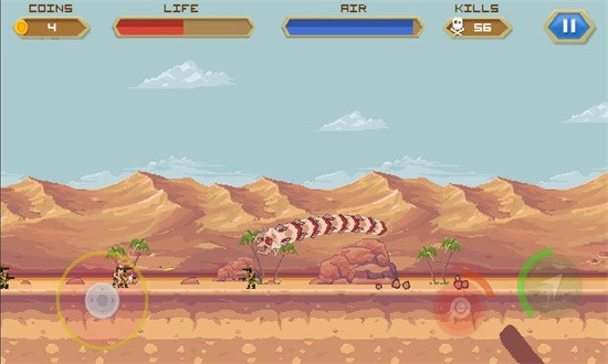 蠕虫攻击是一款极具破坏力的动作游戏,玩家将操控一条凶猛的蠕虫,在沙漠中与人类军队展开激烈对抗。游戏采用直观的双摇杆操作方式,左手控制蠕虫移动,右手控制加速冲刺。面对坦克、直升机等现代化武器的围剿,你需要巧妙运用地形和技能,通过摧毁军事设施来获取能量补给。游戏画面充满张力,物理破坏效果逼真,每一次吞噬都能带来强烈的视觉冲击和成就感。独特的像素风格搭配流畅的操作手感,让这款游戏既充满挑战性又极具解压效果。