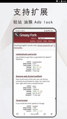 支持扩展,轻站油猴Adblock:提供丰富的扩展支持,从广告拦截到网页美化,用户可以根据个人需求自由定制浏览器功能。
