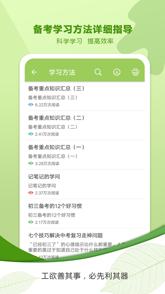 文章:专题精讲、学习方法、小题练习、课外阅读等文章不断为你的中考备考加分。文章内容由一线教师编写,既有应试技巧,也有拓展知识,帮助学生全面提升生物素养。