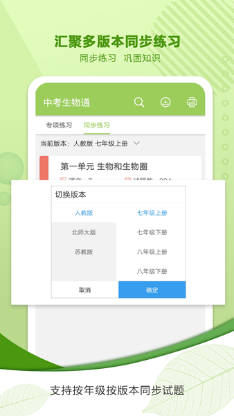 同步练习:支持初中生物人教版、初中生物北师大版、初中生物苏教版等多个版本的年级同步试题。这些试题与教材章节完全对应,方便学生随堂练习,巩固课堂所学知识。