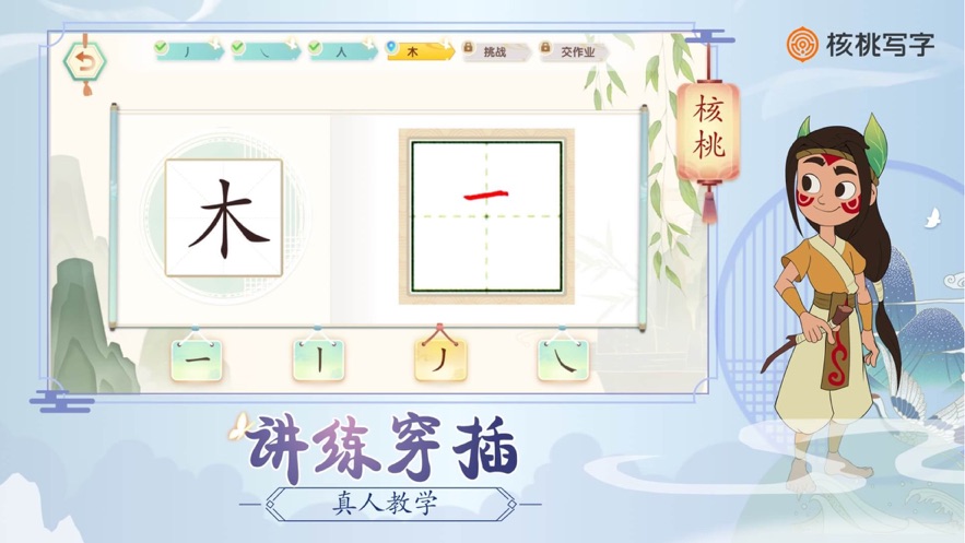 真人示范,带写讲解——区别于传统的事先讲解模式,核桃写字app采用专家实时带写的方式。专业老师会一笔一画地带领孩子完成整个书写过程,确保孩子能够准确掌握每个笔画的起笔、行笔和收笔技巧。这种手把手的教学方式,让孩子对书写要点记忆更加深刻,细节掌握更加到位。
