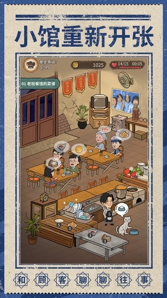 【重新开业】玩家接手的老祝餐馆就像个时光胶囊,每接待一位老顾客就会解锁一段尘封往事。这些跨越十年的故事线相互交织,逐渐拼凑出街区的变迁史。【回到过去】游戏通过精致的像素美术和复古UI设计,完美复刻了90年代的生活场景。从店内的老式挂历到街边的公用电话亭,每个细节都在诉说时代故事。【小馆社交】独特的"味觉记忆"系统让菜品成为打开剧情的钥匙,当客人吃到特定料理时,会触发专属的回忆CG和对话选项,这些互动将影响店铺的口碑和发展方向。