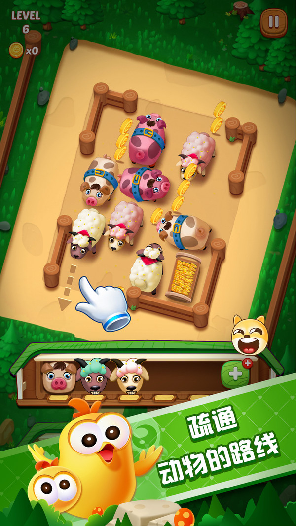 非常有趣的农场游戏,结合华容道的玩法,相当不错。建议玩家先规划好整体移动路线,优先处理靠近边缘的动物。农场里的动物从围栏中滑出,以此来移动它们。可能有动物挡住了彼此的路线,玩家需要找到正确的顺序。只有三只相同的动物才能触发淘汰,从而在较低的插槽中留下更多空间。你需要把所有的动物搬出来通过测试,这样动物就可以在不被困的情况下清理道路。记住,有时候后退一步是为了更好的前进,不要急于求成。