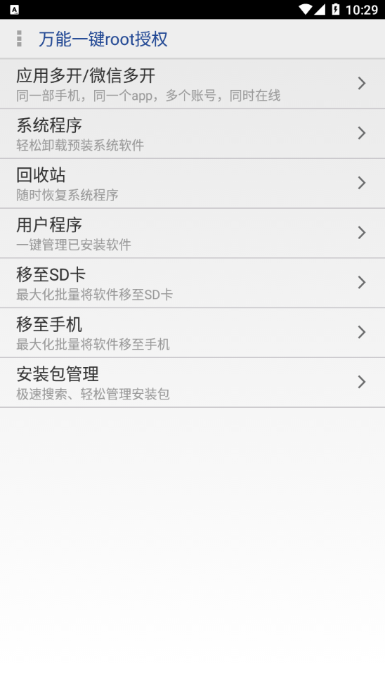 万能一键授权app是一款功能全面且操作便捷的手机root工具,专为安卓用户设计,旨在帮助用户深度管理手机系统,释放设备潜能。这款软件不仅提供一键root权限获取功能,还集成了应用多开、软件管理、系统优化等实用模块,让用户能够轻松玩转手机,享受更自由、更个性化的使用体验。