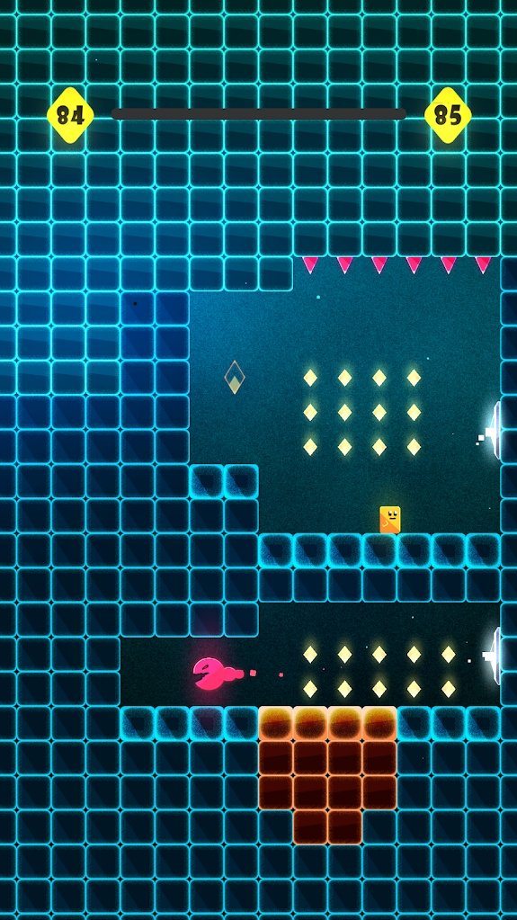 你必须远离墙壁,朝相反的方向转动,当在这种类型的块上并且点击落在屏幕上时,字符不会向相反的方向跳。这个独创的物理引擎创造了令人着迷的反常识游戏体验,需要玩家重新建立空间认知体系。特别设计的"镜像模式"会让整个关卡左右反转,带来全新挑战。
