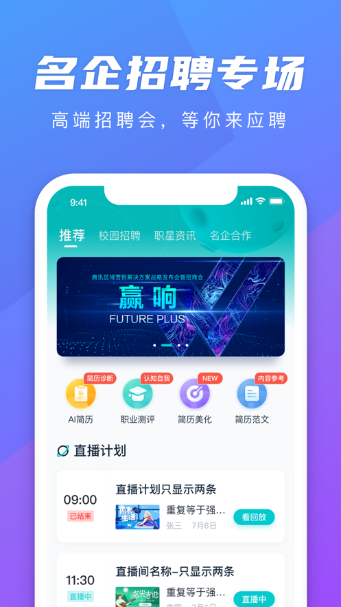 高端招聘会,等你来应聘。平台定期举办知名企业专场招聘活动,提供与HR直接沟通的机会,大大提升求职效率,让优质工作触手可及。