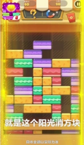 阳光消方块红包版是一款充满趣味与惊喜的休闲消除类游戏。这款游戏在传统三消玩法的基础上进行了创新升级,将阳光方块作为核心消除元素,为玩家带来焕然一新的游戏体验。游戏拥有丰富多彩的方块颜色和精心设计的主题关卡,配合轻松愉快的背景音乐,让玩家在享受消除乐趣的同时还能获得丰厚的现金红包奖励,真正实现娱乐与收益的双重满足。