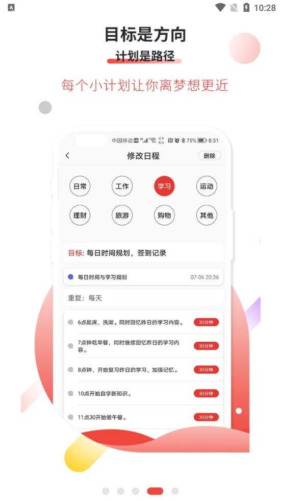 目标是方向,计划是路径,每个小计划让你离梦想更近:独创的目标拆解引擎,将大目标智能分解为可执行的SMART小目标,配合进度可视化,让成长看得见。