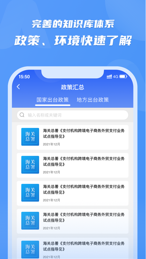 政策汇总:平台建立了完善的政策知识库,持续更新国家及地方跨境电商相关政策法规。用户只需输入关键词即可快速检索相关政策内容,并获取详细的政策解读和实施细则。