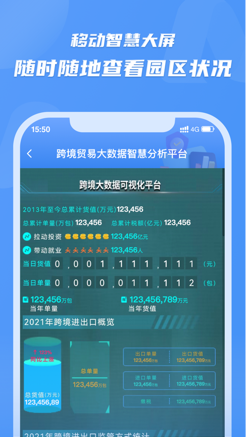 大屏数据:平台完全模拟综保区智慧可视化大屏的展示效果,支持远程访问和个性化配置。用户无论身处何地,都能通过电脑或移动设备查看与实体大屏完全一致的数据可视化内容。