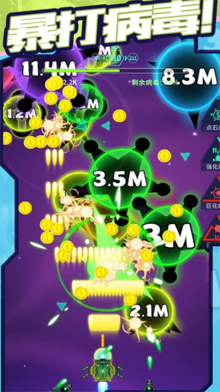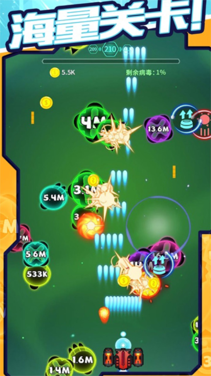 游戏设计了多个造型独特的病毒BOSS,玩家需要运用策略和技巧来击败它们。通过战斗可以解锁各种强力的疫苗战机,每款战机都拥有专属技能和属性。激烈的战斗过程配合轻松愉悦的背景音乐,营造出独特的游戏氛围。创新的射击机制不再局限于传统弹幕躲避,而是鼓励玩家思考如何最大化子弹命中率,这种新颖的玩法带来了全新的射击体验。