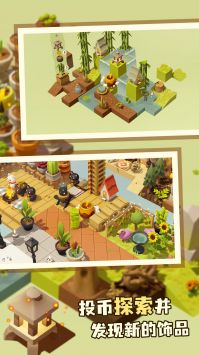 游戏的核心玩法围绕收集和建造展开。玩家可以通过完成任务或探索获得金币,用于兑换各种建造素材和装饰品。独特的天气系统让玩家可以随时调整花园的季节和气候,创造出不同的视觉效果。夜间模式下的灯光布置功能尤为出彩,玩家可以自由设置各种彩灯、灯笼等照明设备,让花园在夜晚也能绽放迷人光彩。此外,房屋外观和背景风格也可以随时更换,满足不同审美需求。