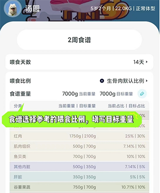 设置和可定制的食谱类型,以辅佐您计算不同类型食物的摄入量。用户可以根据自家宠物的喜好自由调整,系统会自动重新计算营养值。